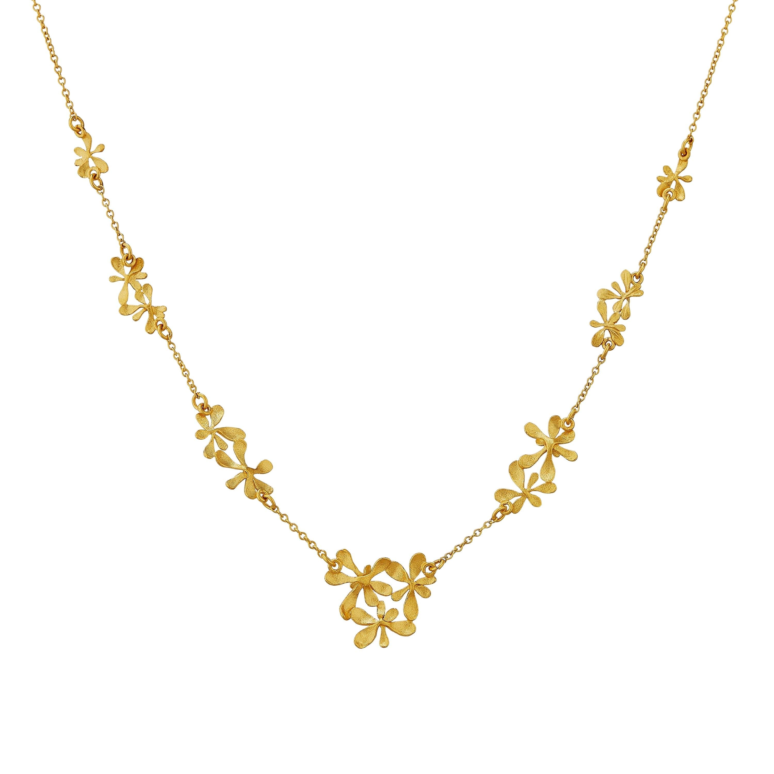 Embrace the resilience and beauty of nature with the Alex Monroe Yellow Gold Plated In-Line Rosette Cluster Necklace. Featuring leafy rosettes that symbolise the tenaciousness of nature in bustling urban environments, this necklace is a stunning celebration of life's humble beginnings. Competing for sunlight, these clusters evoke a sense of wonder and strength.