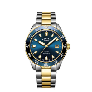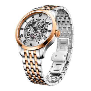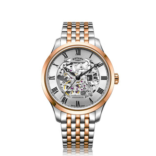 Rotary 42mm Rose Gold Plated Skeleton Automatic Watch with a Blue Leather Strap