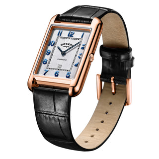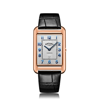 Rotary Rose Gold Plated Cambridge Quartz Watch with a Black Leather Strap