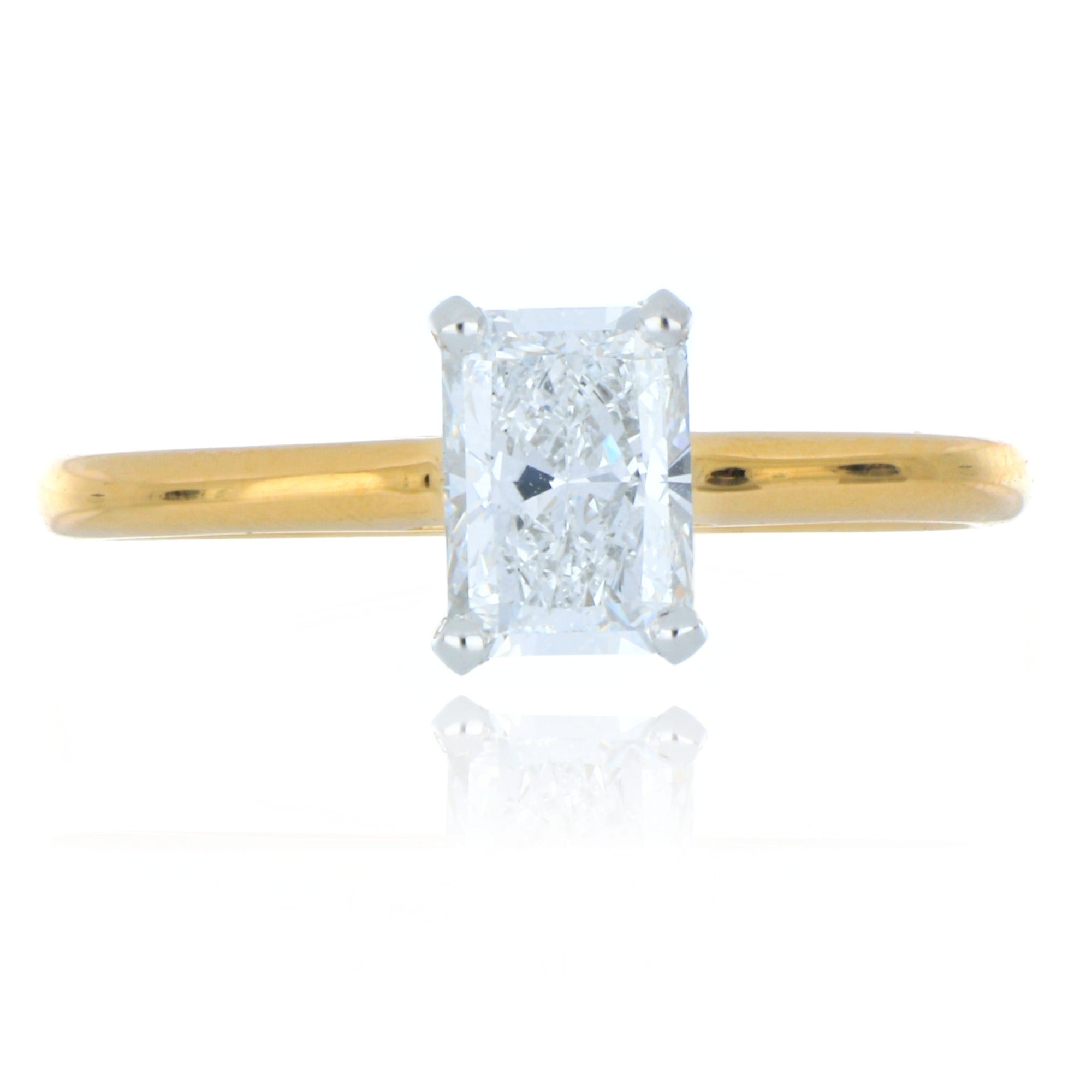 A fresh take on a classic, this radiant-cut solitaire is set in 18ct yellow gold with a sleek platinum four-claw setting — designed for enduring simplicity and style. This Laboratory- Grown diamond is accompanied by an independent Diamond Grading Certificate. Details below.