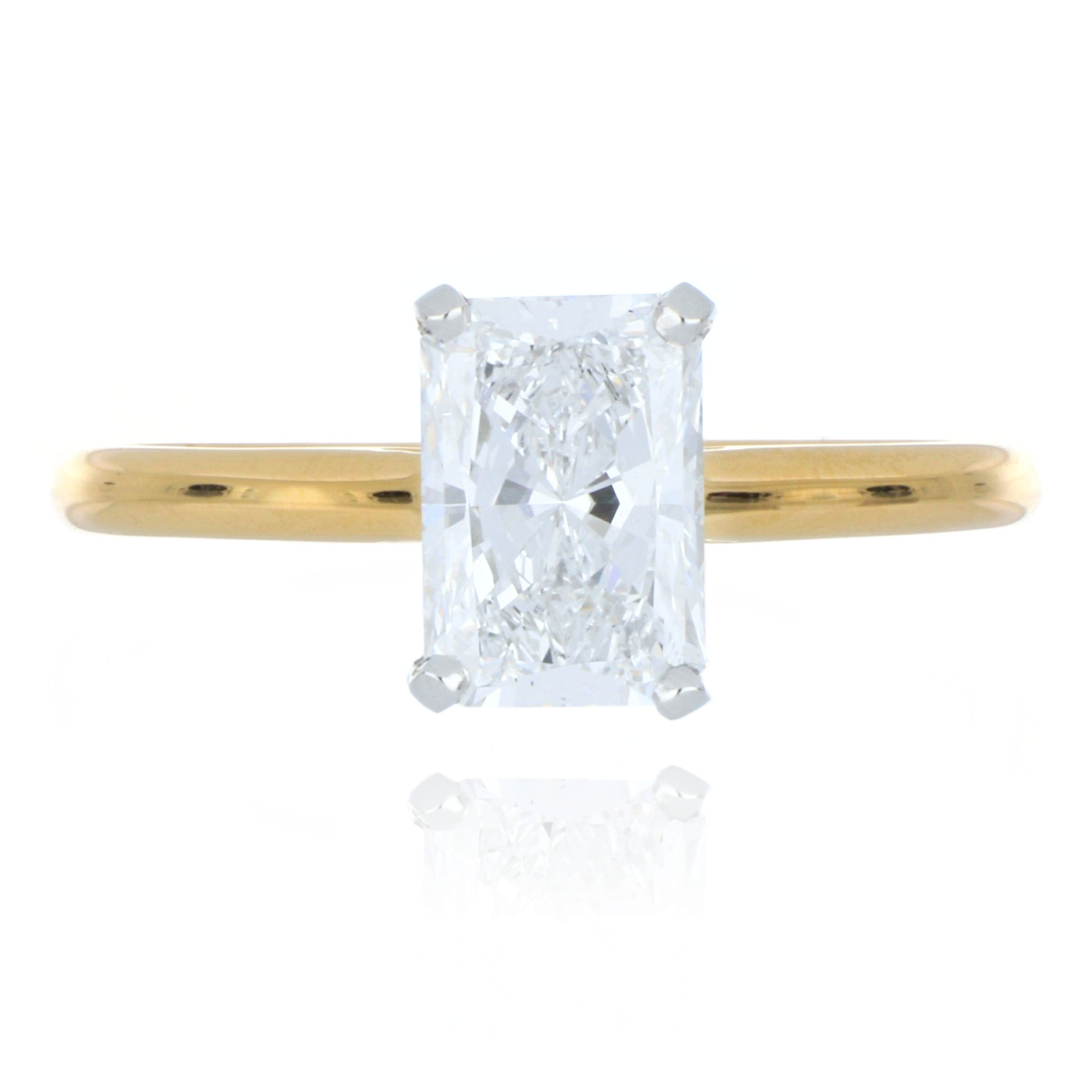 A fresh take on a classic, this radiant-cut solitaire is set in 18ct yellow gold with a sleek platinum four-claw setting — designed for enduring simplicity and style. This Laboratory- Grown diamond is accompanied by an independent Diamond Grading Certificate. Details below.