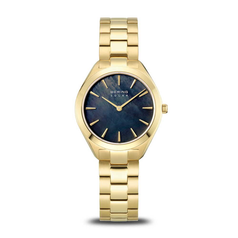 Golden glow meets solar power in this ladies’ watch from the BERING Solar Collection, blending tech-savvy charm with stylish elegance. The deep blue mother-of-pearl dial dances with light like the Arctic evening sky—mysterious and ever-shifting. Slim golden markers and hands add a touch of refinement, keeping the design clean and pure. The polished gold-tone stainless steel case and bracelet shine with feminine radiance. Powered by solar energy, it charges from any light source and runs smoothly for months without needing a battery change. Measuring 31 mm across and just 6 mm thick, it feels light and delicate on the wrist. Protected by flat sapphire crystal and water-resistant up to 5 ATM, it’s both beautiful and practical, finished off with a comfy folding clasp.