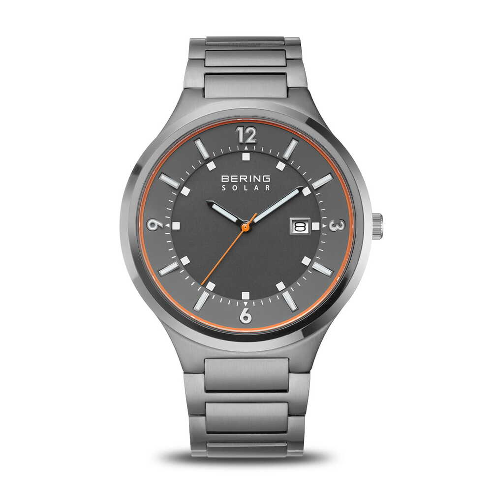 Sleek, smart, and ready for action—this men’s watch from the BERING Solar collection combines clean lines with cutting-edge tech. Its finely brushed grey stainless steel case blends effortlessly into a matching link bracelet, creating a look that’s both tough and modern. The matte dark grey dial pops with bright orange details, adding a sporty kick and eye-catching contrast. Protected by flat sapphire crystal, the dial features clear hour markers, Arabic numerals at 12, 3, 6, and 9, plus a handy date window at three o’clock. Slim yet substantial at 42 mm wide and 9 mm tall, it sits perfectly on the wrist. Powered by a solar movement that charges with any light, it never needs a battery swap. Water-resistant to 5 ATM and finished with a secure folding clasp, this watch is your go-to for workdays and weekends alike.