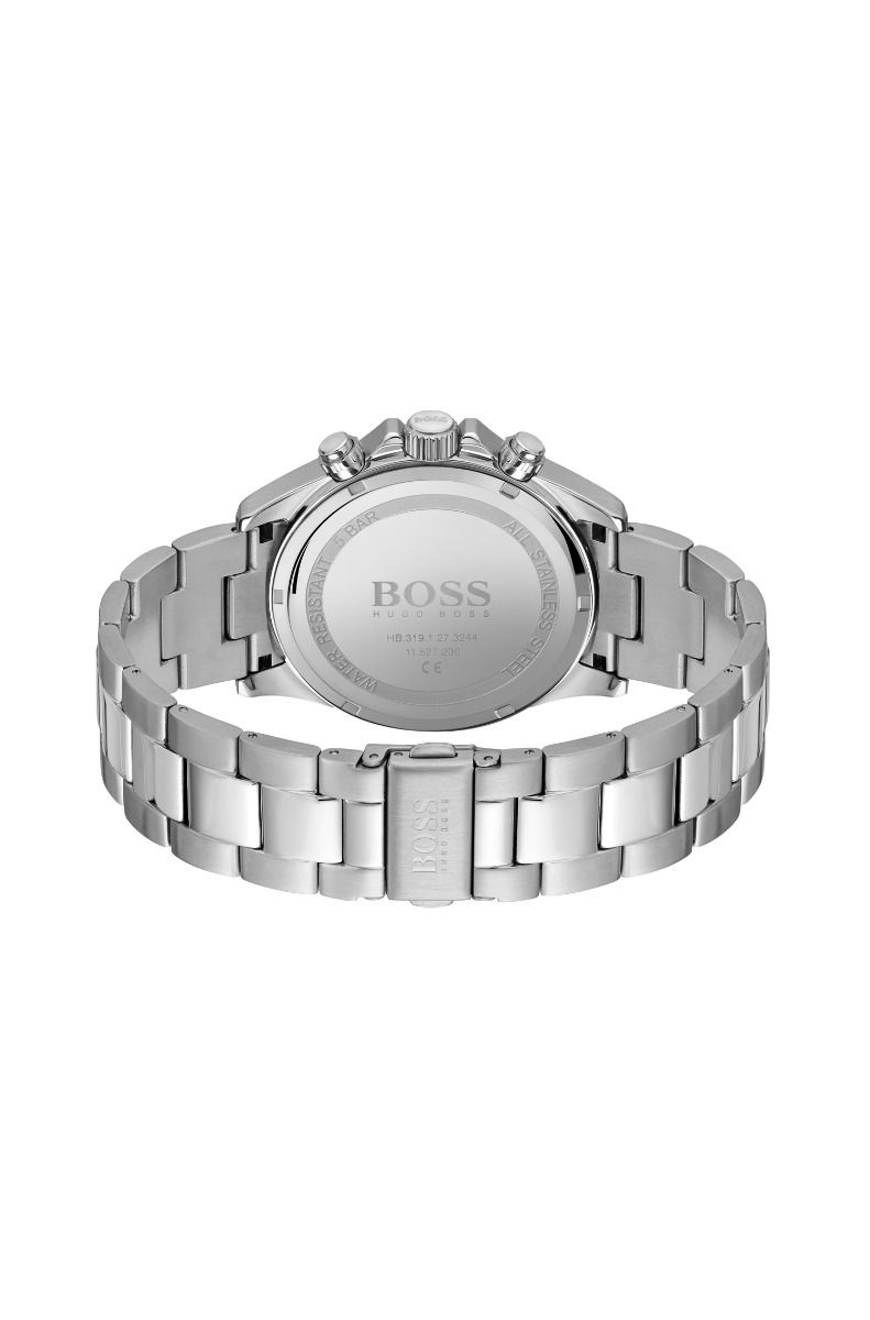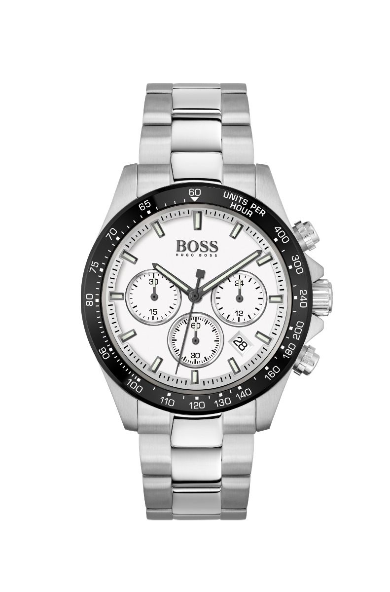 BOSS gents chronograph from the Hero family. Featuring a 43mm stainless steel case, white sunray dial, black tachymeter bezel, stainless steel bracelet and push button deployment. Water resistant to 5ATM