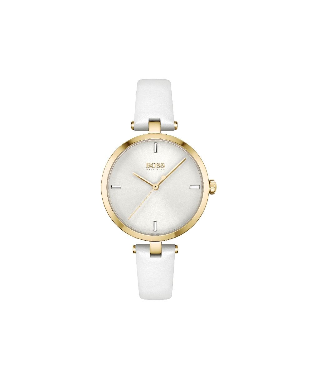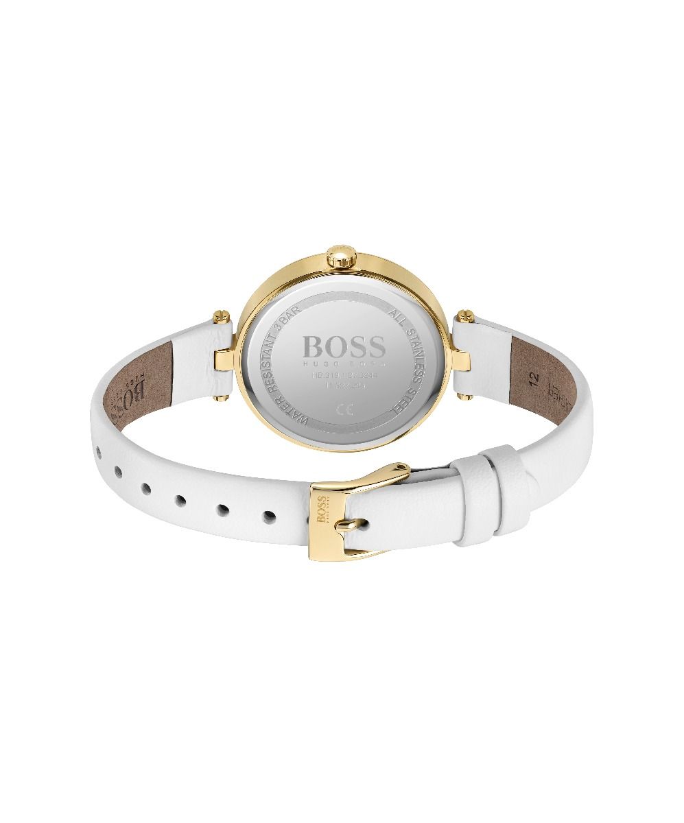 BOSS ladies watch from the Gala family. Featuring a 28mm stainless steel case with crystal set bezel, white Mother of Pearl dial and stainless steel pressed mesh bracelet. Water resistant to 3ATM