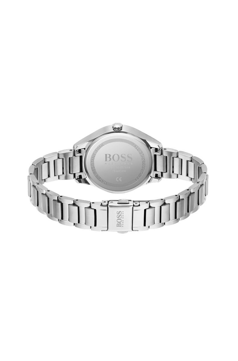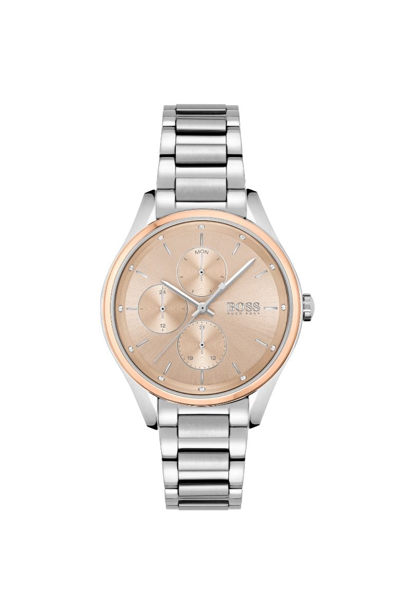 BOSS ladies watch from the Grand Course family. Featuring a 36mm stainless steel case, carnation gold IP bezel, carnation gold sunray dial with crystal detail, stainless steel bracelet and push button deployment. Water resistant to 3 ATM