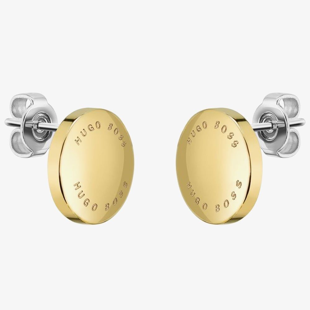 BOSS ladies earrings from the Medallion collection. Features yellow gold IP stainless steel medallion etched with HUGO BOSS logo. Medallion diameter: 11mm