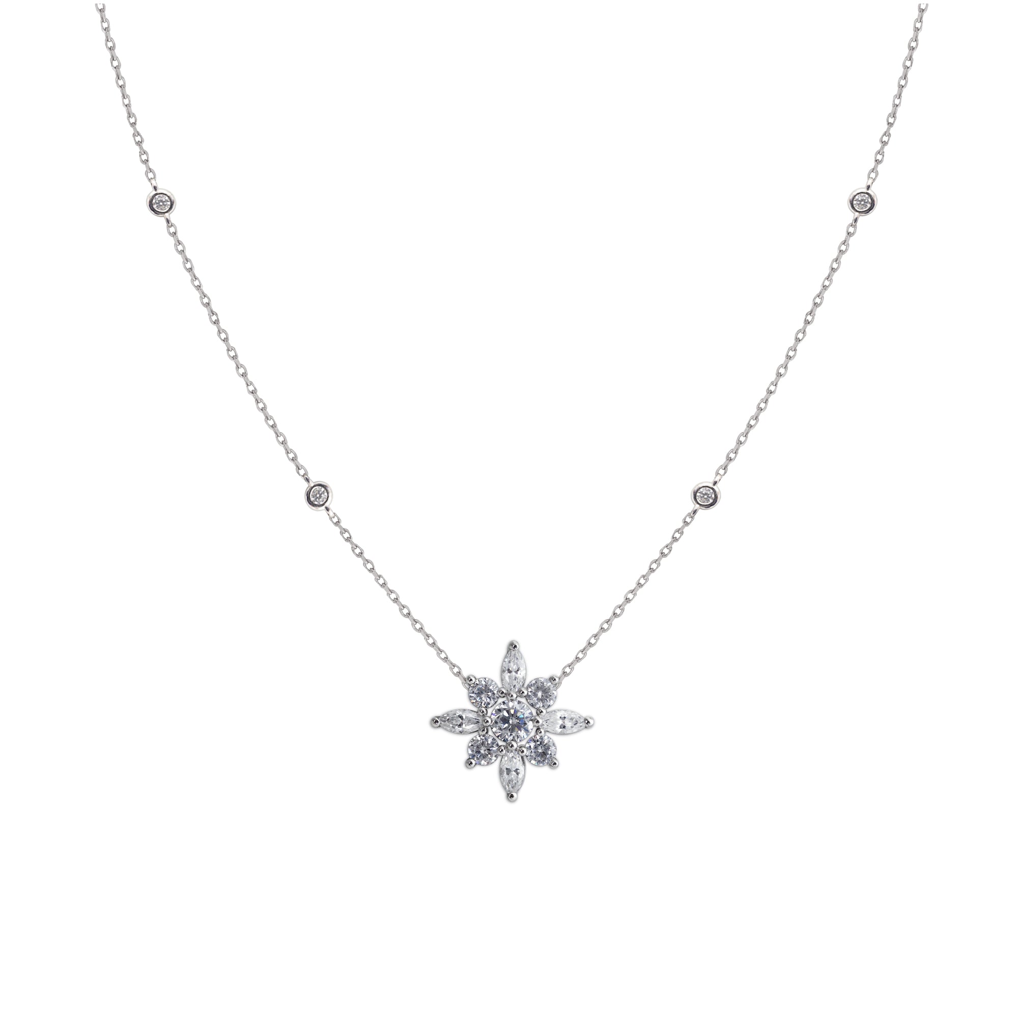 This necklace features a delicate chain embellished with round brilliant cut stones in a bezel setting. A cluster of round and marquis stones resembles a flower with a hint of vintage romance. Add a touch of sparkle to your everyday wear.