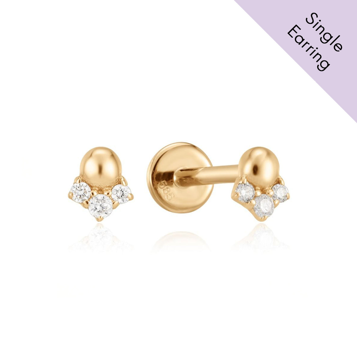 This 14ct yellow gold stud features a central ball with three graduated round brilliant cut diamonds set to one side.