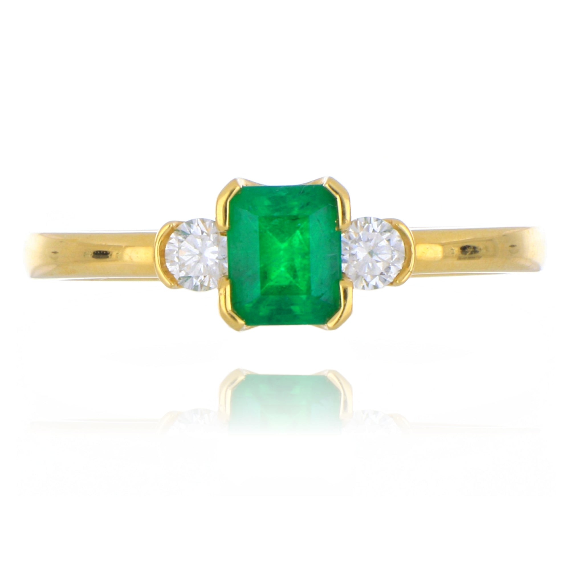 This exquisite 18ct yellow gold ring showcases a vibrant 0.57ct emerald as its centrepiece, flanked by two sparkling diamonds that enhance its rich green hue and add a refined brilliance. The warm yellow gold setting beautifully complements the emerald’s depth of colour, creating a harmonious and elegant design. Expertly crafted with attention to detail, the three-stone arrangement symbolizes a meaningful journey, making it an ideal choice for commemorating special moments. Combining timeless style with superior craftsmanship, this ring offers both enduring beauty and comfortable wear for any occasion.