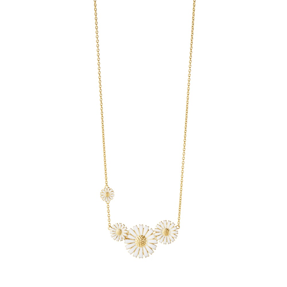 Four radiant daisies cluster together in this charming pendant, celebrating Georg Jensen's most beloved collection with style and grace. Each sterling silver bloom is kissed with 18ct gold plating and dressed in creamy white enamel, creating a piece that's both refined and wonderfully wearable. Whether you're dressing up or keeping it casual, this cheerful floral treasure brings a touch of botanical beauty to every moment.