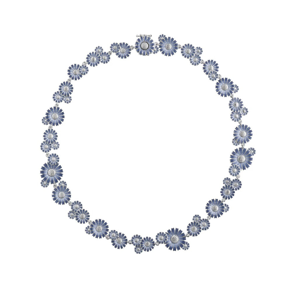 A stunning layered daisy in silver and blue takes centre stage in this captivating necklace that effortlessly commands attention. Born from Georg Jensen's legendary Daisy collection—itself inspired by a 1940s brooch that charmed Denmark's Queen Margrethe II—this piece strikes the perfect balance between refined sophistication and playful personality. Wear it and let your neck tell a story of timeless elegance with a modern twist.