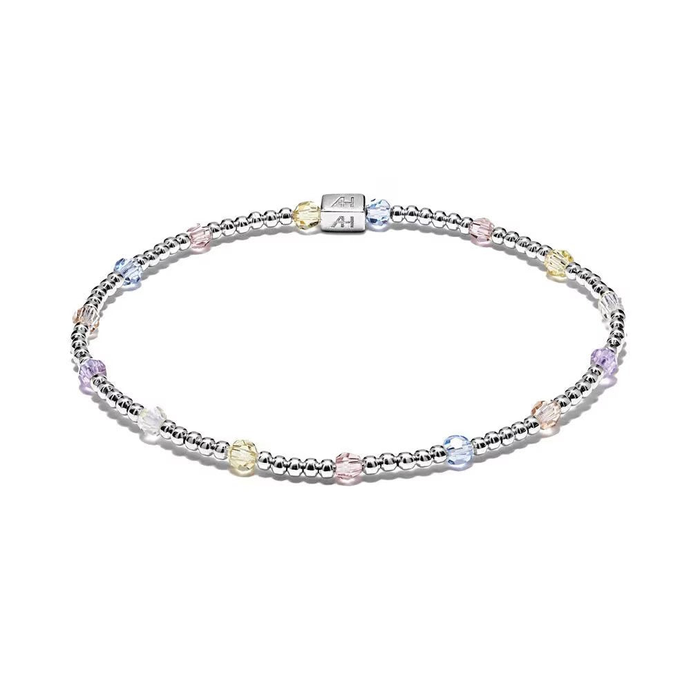 Bring your Spring/Summer style to new heights with our Mirage charm bracelet. This handcrafted piece is made with top-notch 925 Sterling Silver beads and features sparkling Preciosa crystals in an array of eye-catching pastel shades. Expertly threaded on high-quality elastic in the UK, this stretchy bracelet will fit snugly on any wrist.