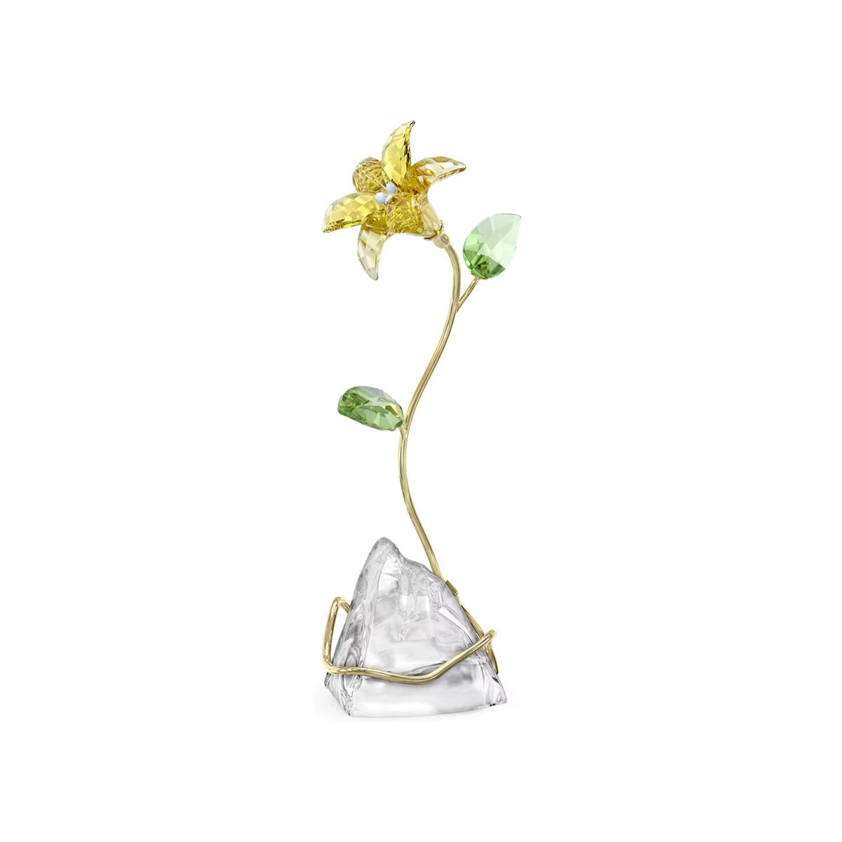 This radiant lily perfectly encapsulates Swarovski’s savoir-faire. Produced with 222 light-catching facets, the yellow flower is accompanied by green crystallised leaves, all set on a gold-tone metal stem that gracefully entwines across a natural unfaceted crystal base. Representing purity and innocence, this freestanding design would make a truly elegant addition to any home décor. No vase or base required. Decoration object. Not a toy. Not suitable for children under 15.