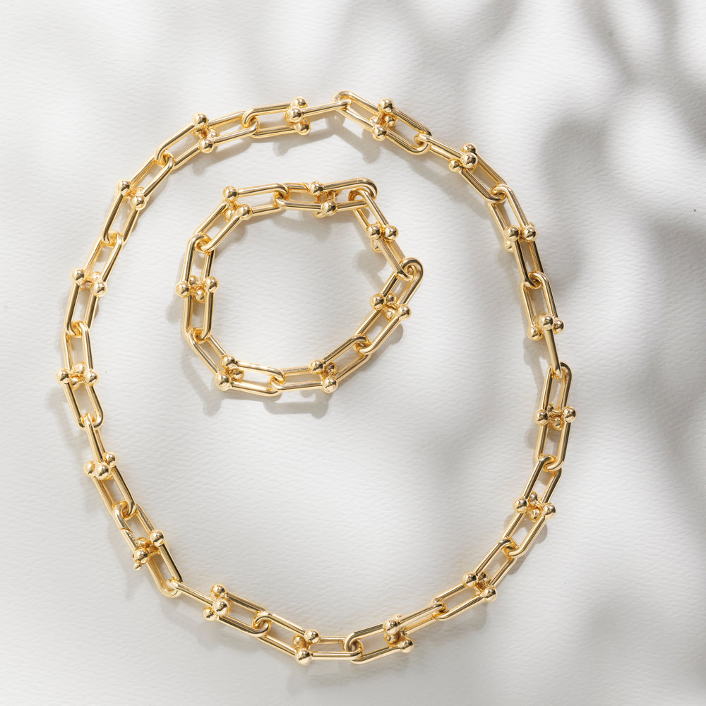 Crafted from 9ct yellow gold, this contemporary necklace features distinctive linked segments adorned with delicate bobble accents, creating an understated yet striking aesthetic. At 18 inches, its refined proportions work seamlessly across casual and formal occasions, making it a versatile addition to any jewellery collection.