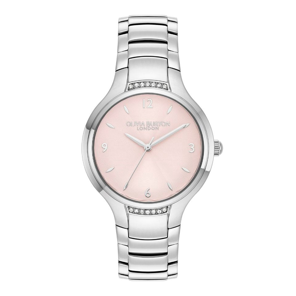 This Olivia Burton 34mm Stainless Steel Classic Lea Quartz Watch is beautifully crafted with a stainless steel case and link bracelet strap. The blush pink watch face offers a touch of femininity, while the crystal details add a hint of glamour. This stunning watch is a perfect addition to any collection.