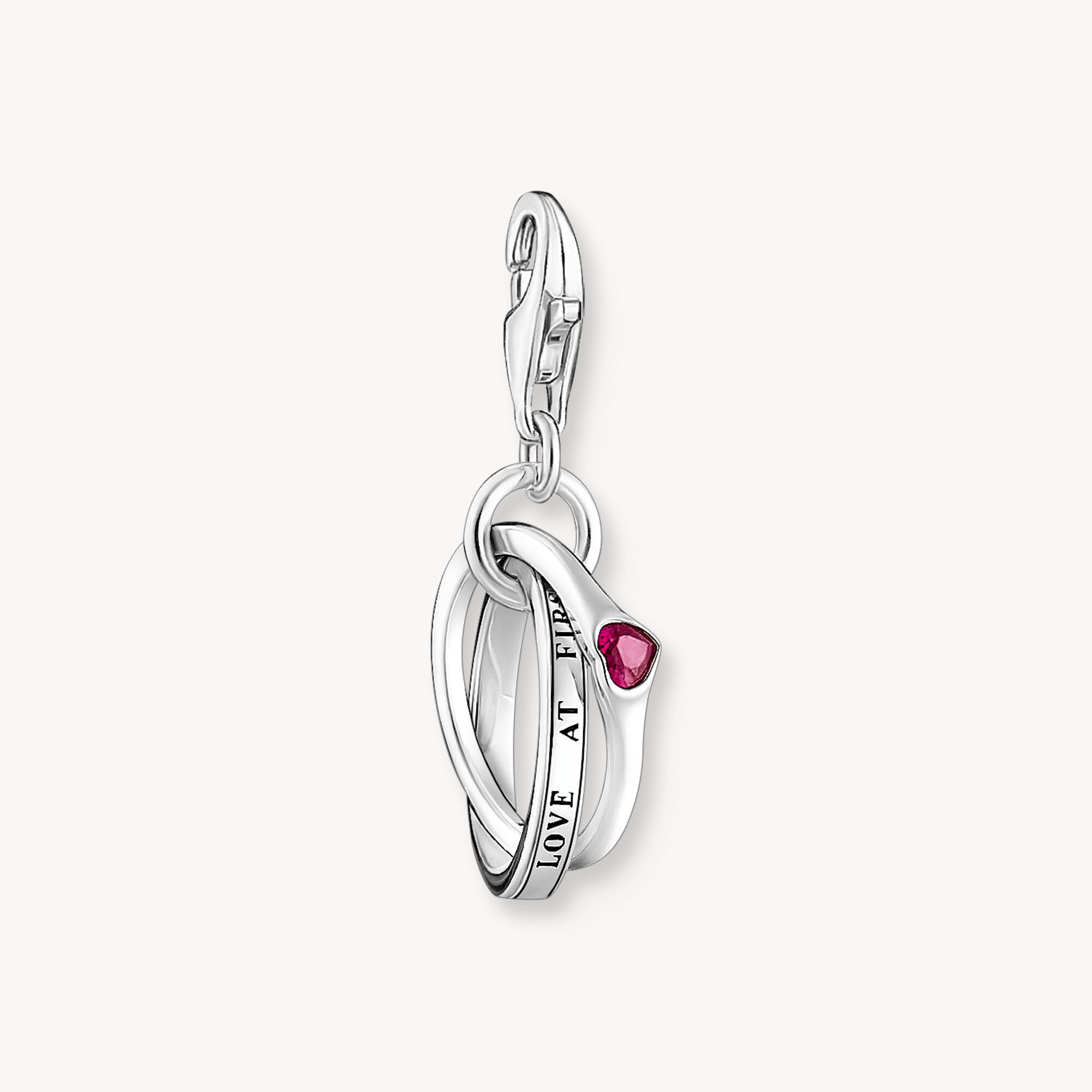 This charm is a symbol of endless affection. Made of recycled, slightly oxidized silver, the three-dimensional design features two intertwined rings, representing the strong bond between a loving pair. One is etched with LOVE AT FIRST SIGHT, while the other is adorned with a heart-shaped, ruby-hued stone. It's a perfect representation of the Together rings' significance.