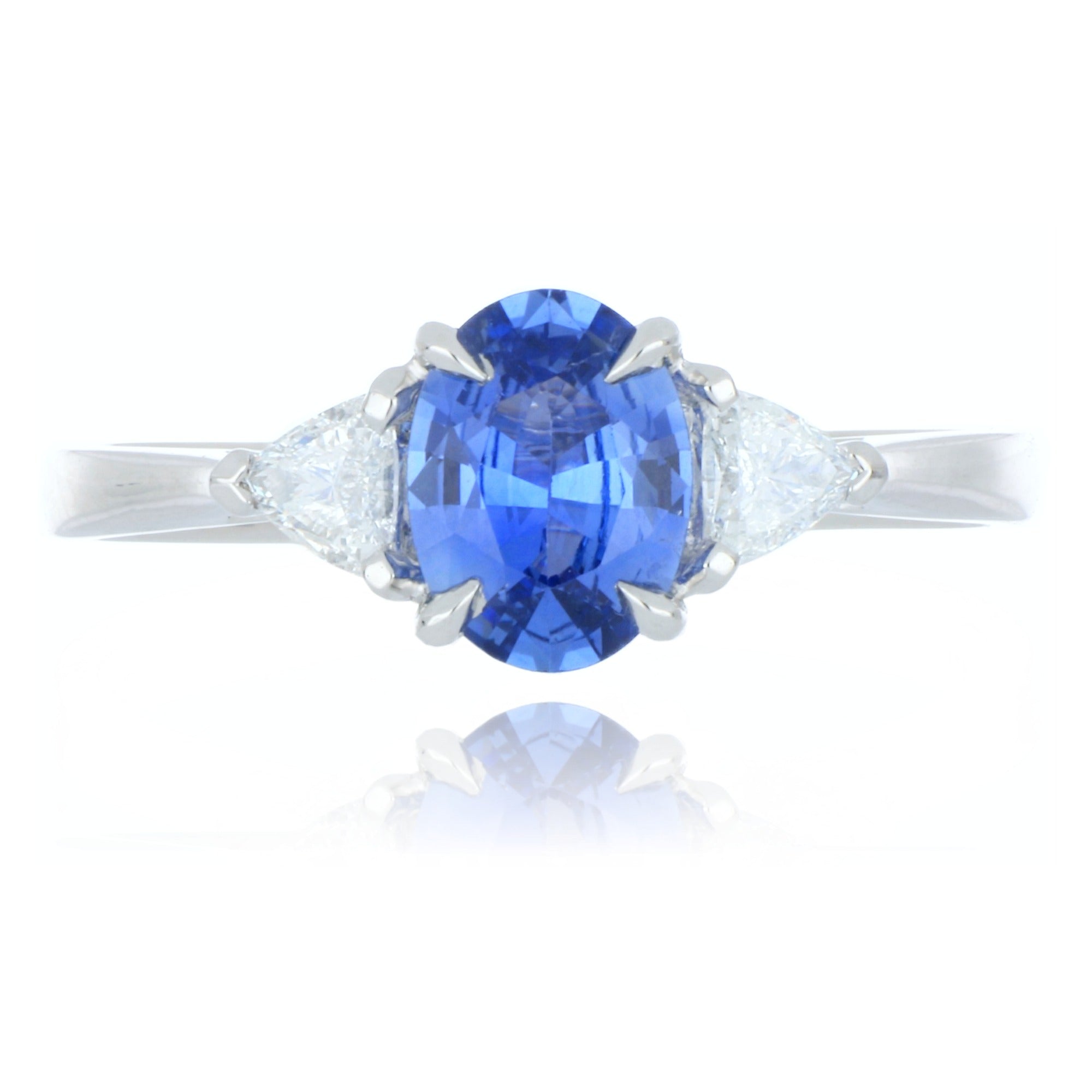Elevate your elegance with this stunning Platinum Three-Stone Ring, featuring a brilliant 1.18ct Oval Cut Ceylon Sapphire at its center. Flanked by two Trillion Cut Diamonds totaling 0.25ct, each stone is set in a secure claw setting that maximizes sparkle and showcases the gemstones’ natural beauty.