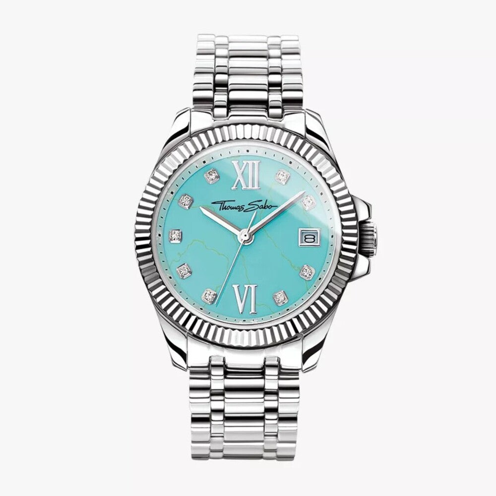 Meet the Thomas Sabo WA0317-201-215-33MM, a stunning ladies’ watch that’s as durable as it is dazzling. Crafted from stainless steel for top-notch quality, its vibrant turquoise dial adds a splash of personality you won’t forget. With water resistance up to 100 metres, it’s perfect for a swim but best to skip the wild water sports. Plus, it arrives in its original box, backed by a manufacturer’s guarantee—ready to brighten your day right out of the package!