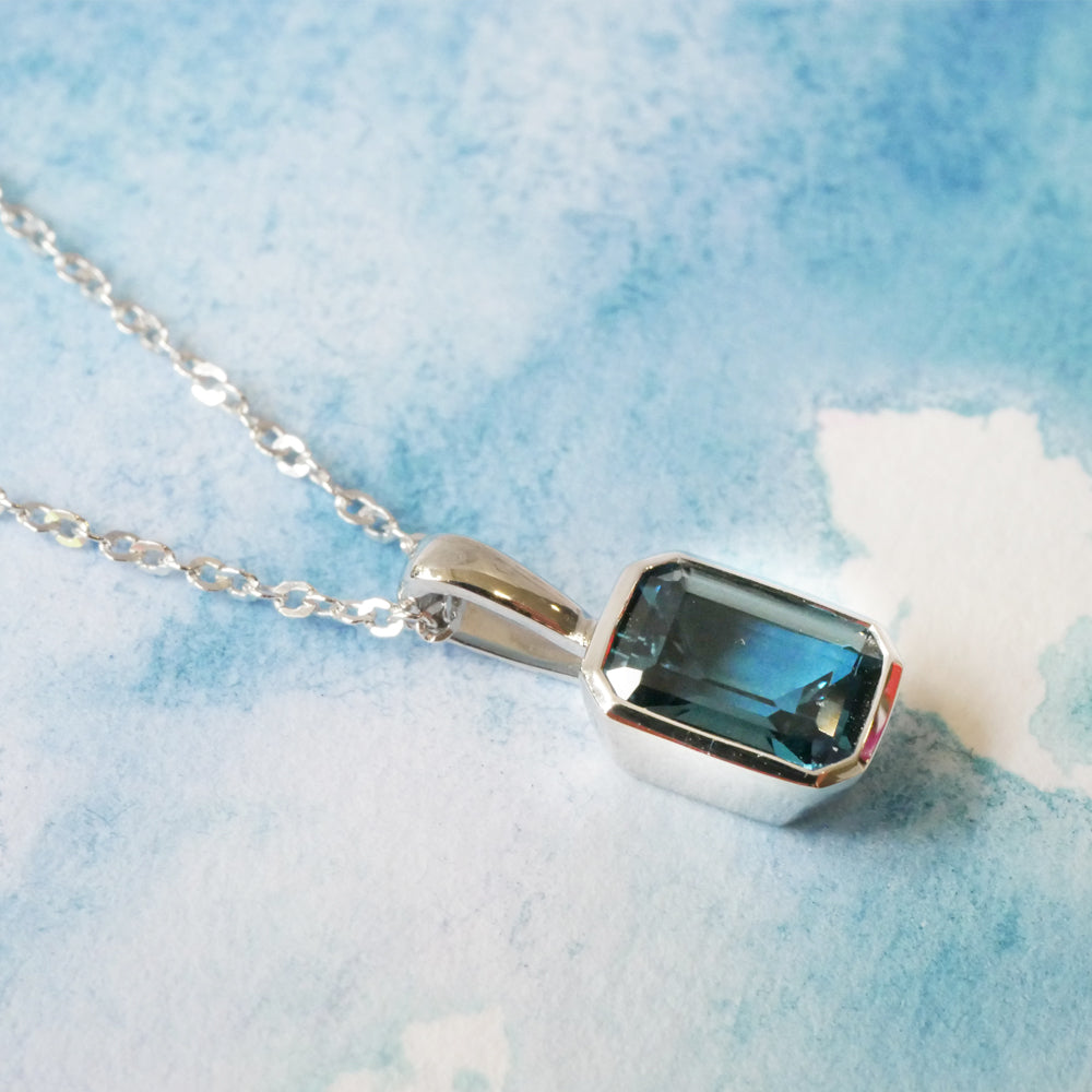 A simple yet beautiful Lonon blue topaz pendant. This solitary octagon cut stone measures at 8x6mm with a weight of 0.92ct, and is sumptuously wrapped with a 9ct white gold bezel setting. This pendant is suspended from an adjustable white gold trace chain, being able to choose between the lengths of 16” to 18”. This stone is said to represent courage and wisdom, while being the perfect gift for anyone born in the month of September, or those who are a Scorpio. Note we do have both a earrings and ring to match, for those looking to have the perfect matching set.