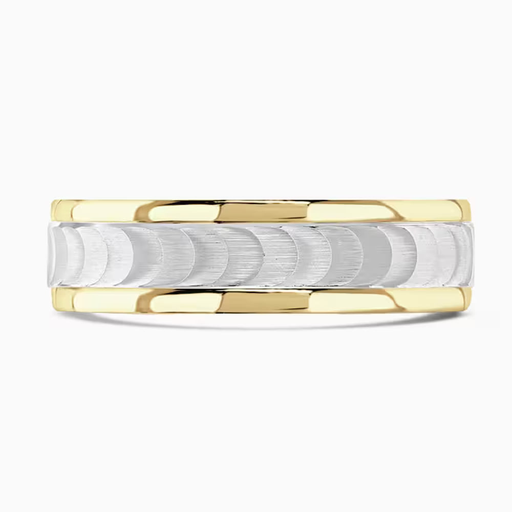 Discover a playful twist on a classic with this 18ct yellow gold wedding ring. Featuring a striking flat top design, the band is beautifully decorated with an eclipse pattern running through its centre, adding a hint of mystery and elegance. The drop rolled edges frame the design perfectly, creating a bold contrast that catches the eye. At 5mm wide, this ring balances subtlety and presence, making it an iconic choice for those who wants a unique yet timeless symbol of love. Perfect for those who like their style with a bit of character and charm.