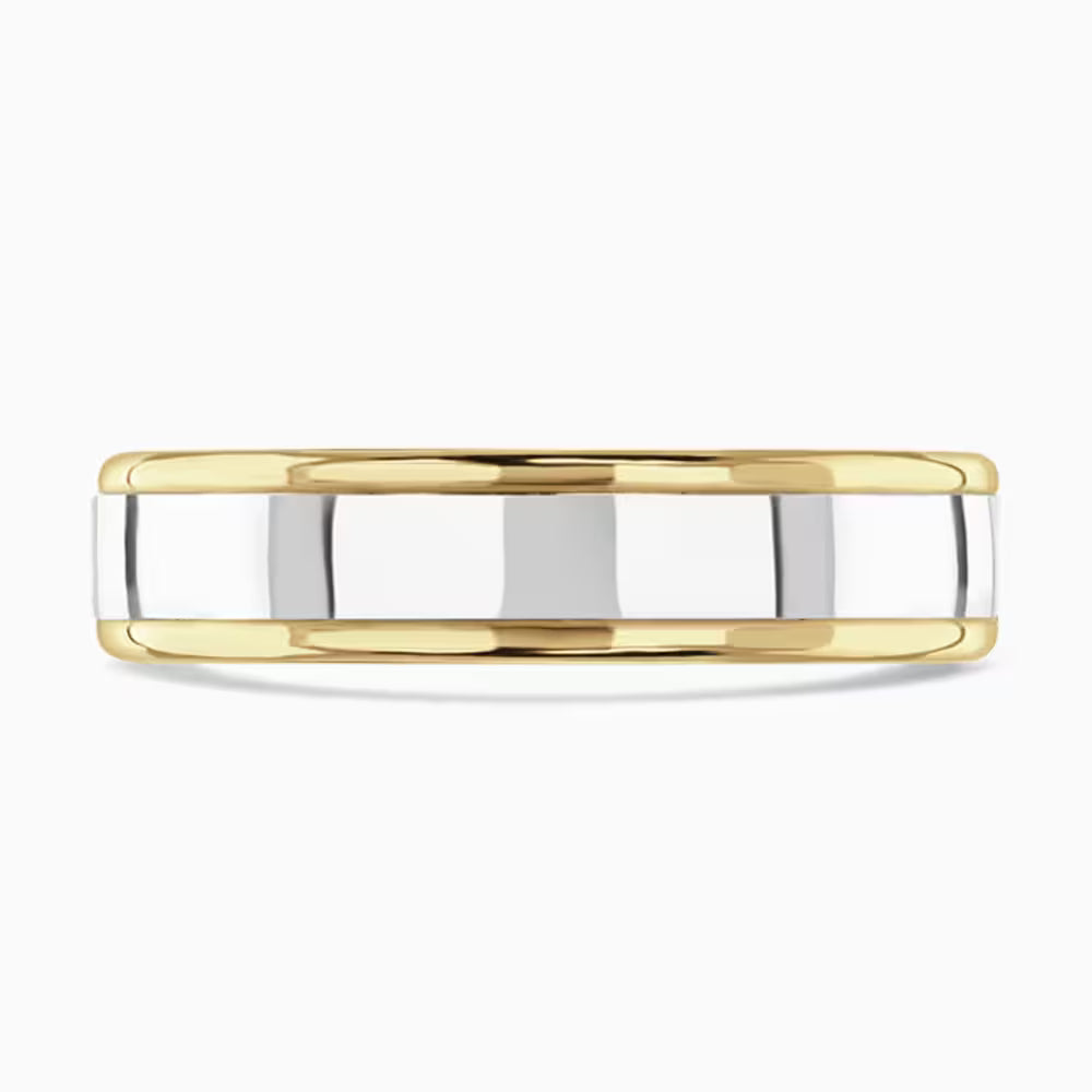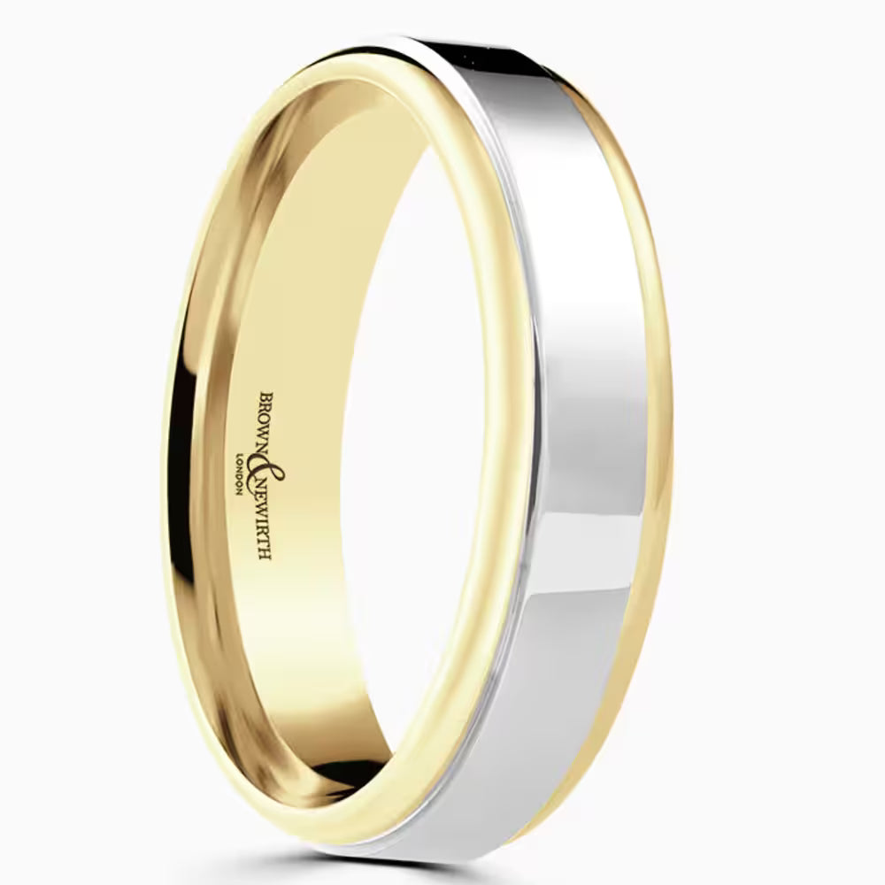Step into timeless style with this 18ct white and yellow gold wedding ring. Its flat top profile is sleek and modern, while the contrasting drop rolled edges add a fun pop of colour and playful detail. At 5mm wide, it offers a bold statement without losing classic charm. Perfect for couples who want a ring that’s both elegant and full of personality, this design balances tradition with a fresh twist, making every day feel a little more special.