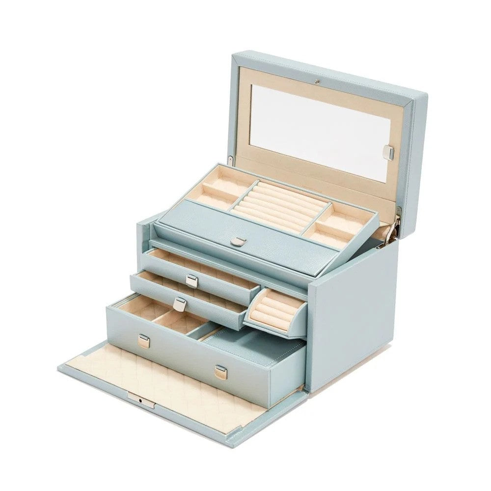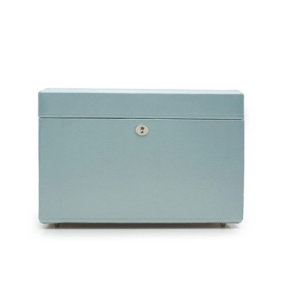 For over a decade, the WOLF London collection has been the epitome of classic box-making tradition, timeless style, and the joy of organizing our prized possessions. The medium-sized jewellery box boasts lizard embossed leather, a glass mirror, chrome fittings, and a lock and key. Its interior is lined with our patented LusterLoc™ technology, which protects against harmful gases that can cause tarnishing for up to 35 years.