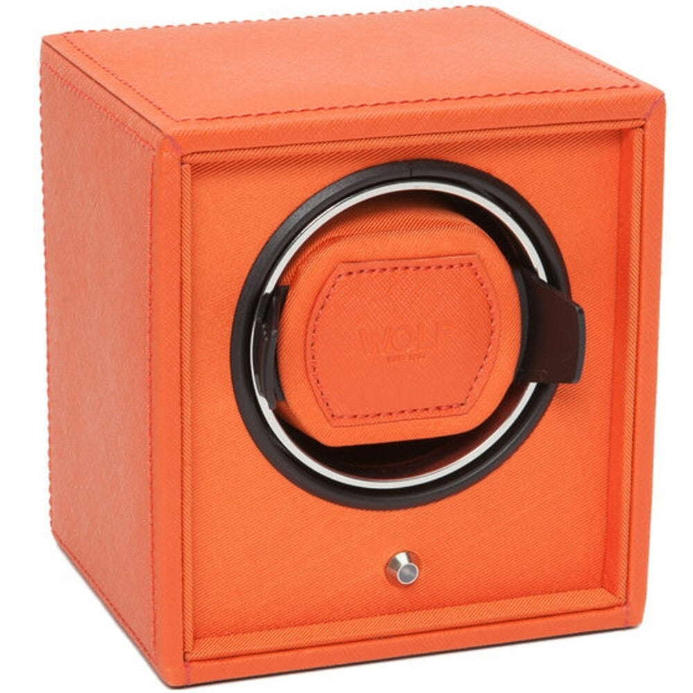 The Cubby: Your Watch's New Playground! This sassy orange timepiece spinner comes dressed in textured leatherette with a matching grosgrain faceplate and shiny chrome bling! Perfect for your fancy wrist candy from Rolex to Hublot, it performs 900 daily twirls in both directions after a polite 10-second pause. Your watch gets cozy in a super-secure cuff that hugs even chunky 52mm cases! Power options? Take your pick - plug it in with the included adapter or pop in some AA batteries (lithium ones last twice as long - they're overachievers like that). At just 13.5 x 11.5 x 14.5 CM, this vibrant little cube brings serious fun to serious watch care!