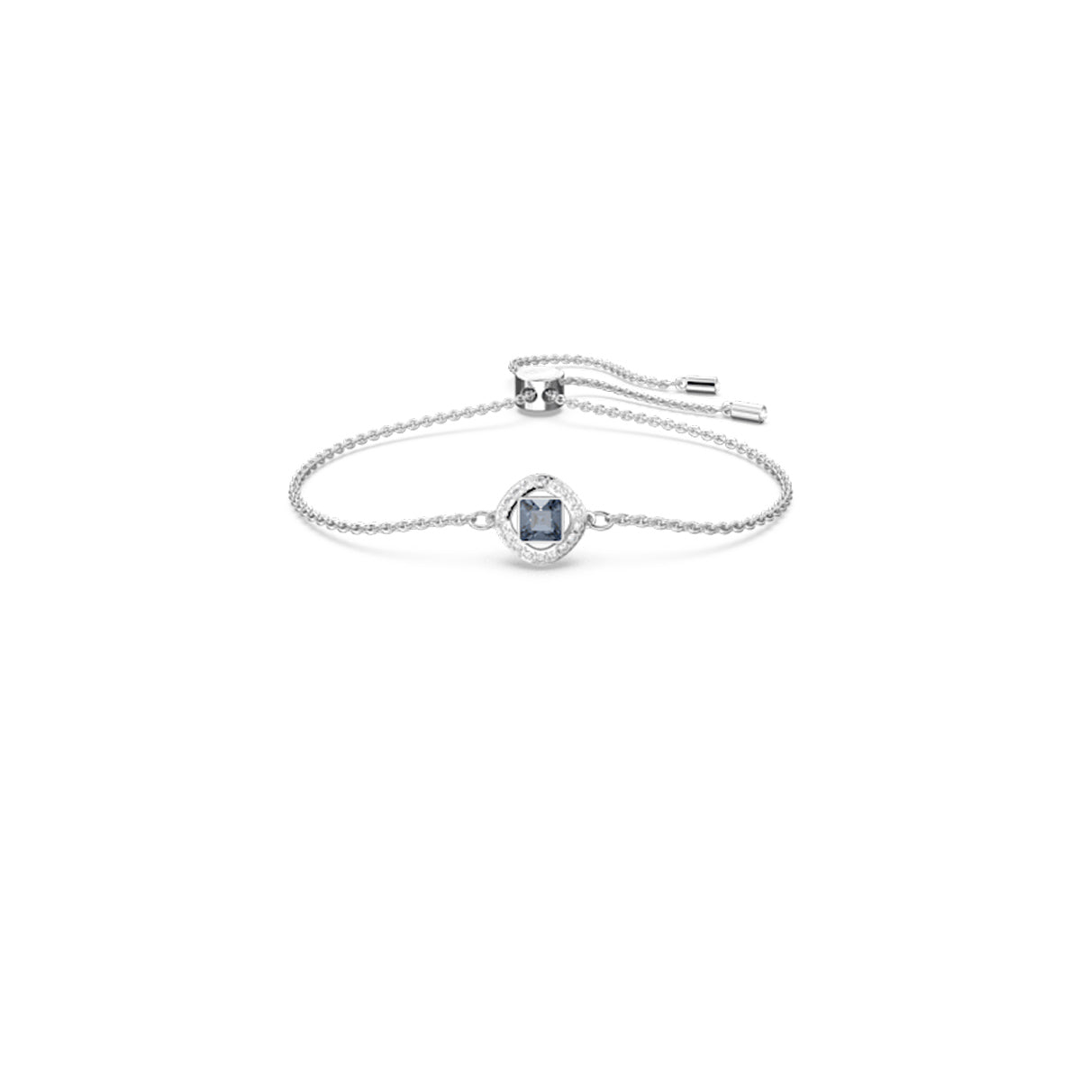 Beautiful in its simplicity, this bracelet adds a subtle touch of colour to your wrist. It features a cool blue center stone surrounded by a circle of shimmering clear pavé set on timeless rhodium plating. Simply adjust the bracelet to your preferred size using the sliding closure. This would make a special gift for a loved one, or a versatile piece to wear every day.