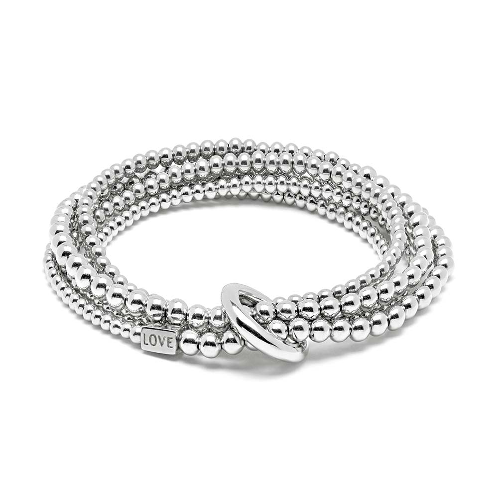 This stunning Yard of Love Bracelet is sure to make a statement on your wrist. With a continuous strand of Sterling Silver beads threaded onto high quality jewellery elastic, this bracelet loops around the wrist in a wrap style and is held together with a Sterling Silver binding ring.