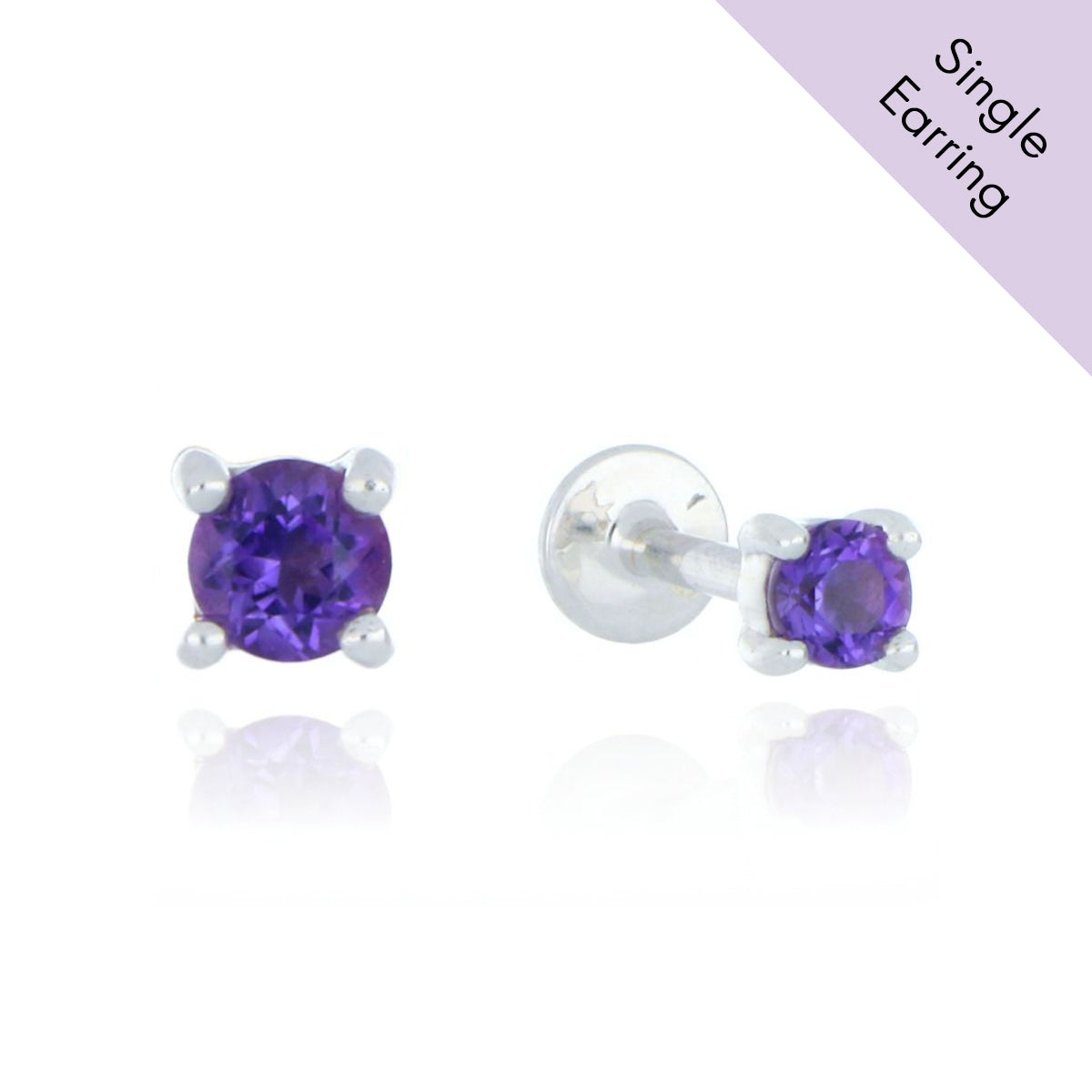 This 14ct white gold stud features a single round 3mm amethyst in a four claw setting.