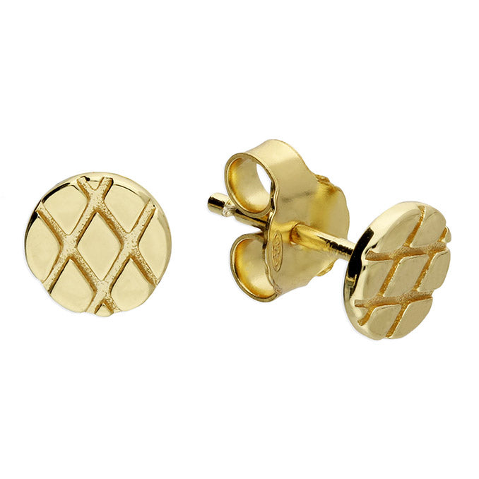 Make a bold statement with these quirky 18ct yellow gold plated round cross hatch stud earrings. Their unique cross hatch design adds a playful twist to your everyday look. These earrings are perfect for those who want to add a touch of fun and style to their accessory collection.