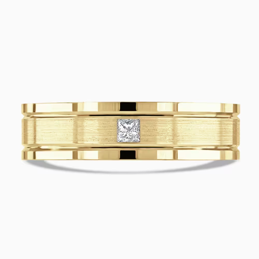 Make a statement with this iconic flat top wedding ring, featuring a single bezel-set square princess cut diamond that sparkles with 0.08ct total brilliance. Nestled within a matte centre, the diamond stands out beautifully against the contrasting polished edges, adding a playful yet elegant touch to your finger. Crafted from warm 9ct yellow gold, this ring blends classic craftsmanship with modern style, perfect for those who love a bit of sparkle without going over the top. Celebrate your special bond with a ring that’s as unique and bright as your love story.