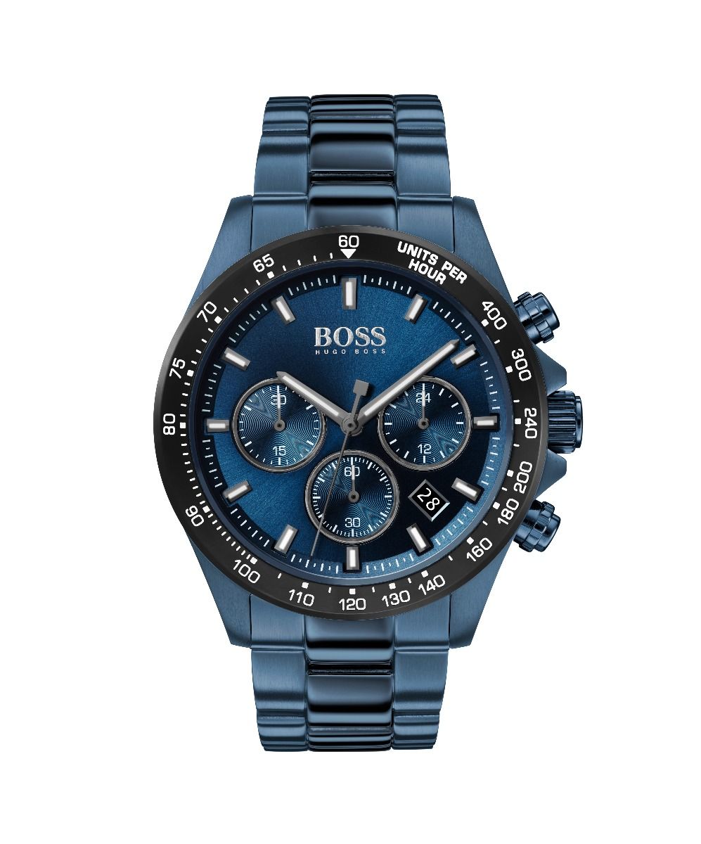 BOSS gents watch from the Hero family. Featuring a 43mm blue IP case, crown protection, tachymeter bezel, blue dial, blue IP bracelet and push button deployment. Water resistant to 5ATM.