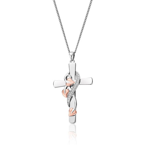 Clogau's iconic Tree of Life design is elegantly presented in this stunning sterling silver cross pendant. Leaves, berries and vines are intertwined in silver and rare Welsh 9ct rose gold to represent new life emerging from the old - wrapped around a silver cross to symbolise the beautiful continuity of nature. This elegant pendant is sprinkled with white topaz gemstones.