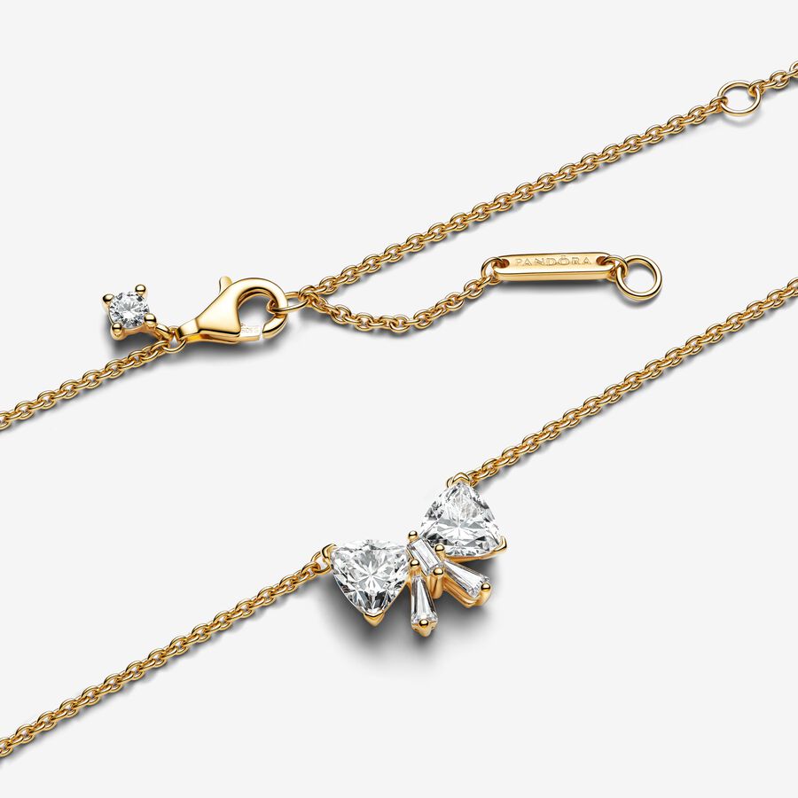 Complete any outfit with a bow, because no ensemble is complete without one. This unique necklace features sparkling cubic zirconia arranged into a 14k gold plated bow-shaped centrepiece that can be adjusted on the chain with a maximum chain length of 45cm. The stones are cut specifically to form the shape of a bow, tying together all your looks with a touch of festive sparkle. Whether you're treating yourself or someone special, this collier necklace is sure to be a top pick.
