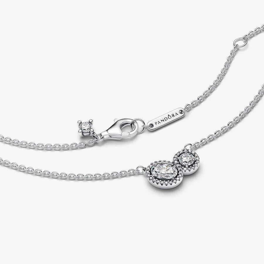 Two stunning gems, connected by a halo paved with shimmering stones, embody the essence of connection. Complete with a flexible chain and a delicate accent gem, this classic style embodies the power of love and unity. This necklace chain has a maximum length of 45cm.