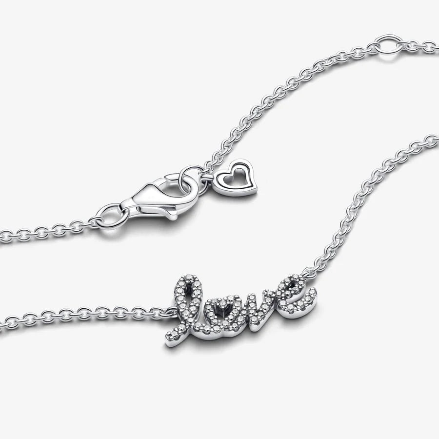 Express your feelings with the Sparkling Handwritten Love Collier Necklace. This necklace is made of sterling silver and has a pendant in the shape of the word "love" written by hand. The letter "o" is in the form of a heart, adding a fun twist. The chain can be adjusted to three different lengths and features a small heart charm near the clasp. Give it as a wearable love message to someone special - whether that's you or someone else! The necklace chain has a maximum length of 45cm.