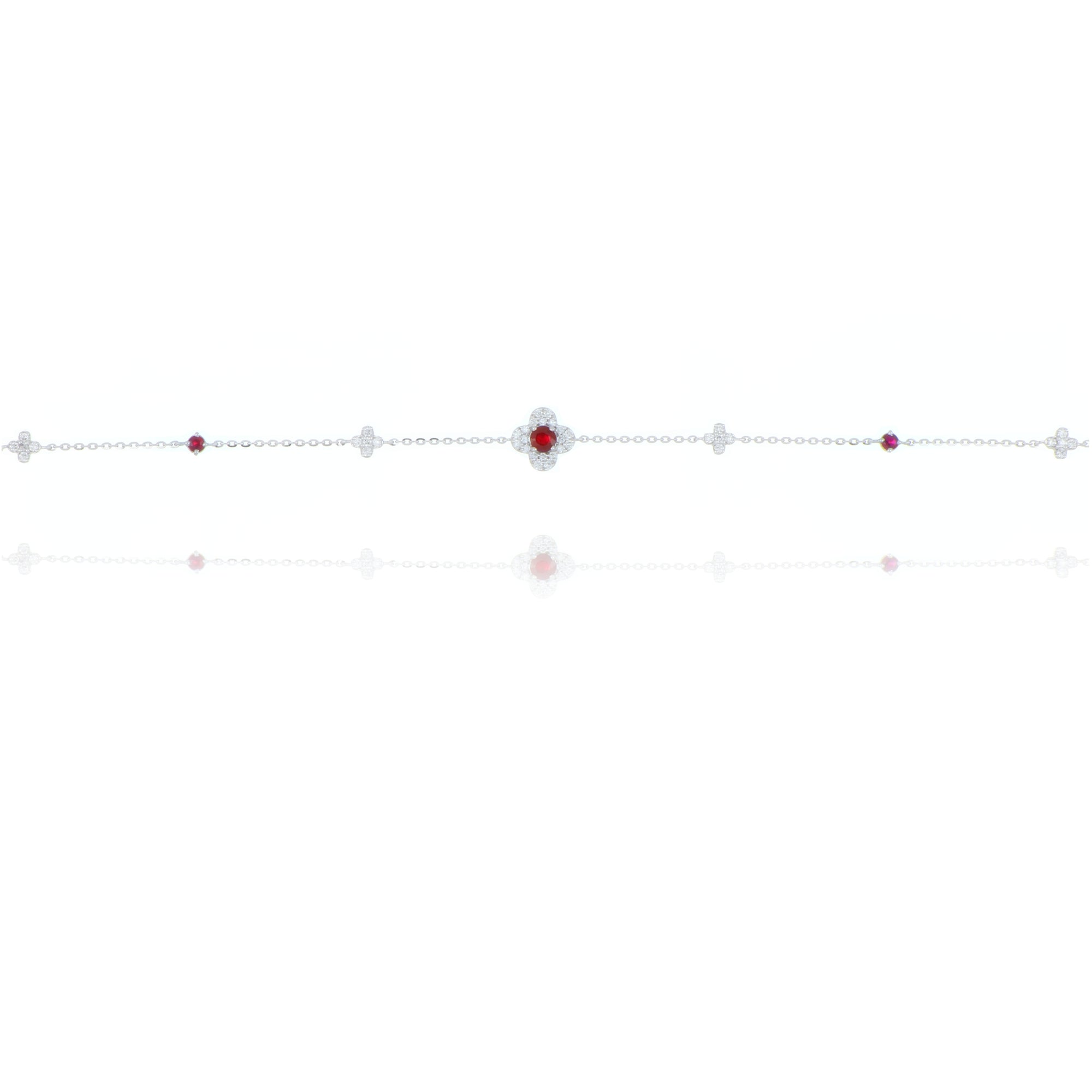This exquisite bracelet is crafted in 9ct white gold and features a delicate chain adorned with charming clover motifs, a symbol of luck and elegance. Each clover is set with a vibrant ruby and accented with sparkling diamonds for a refined and balanced design.