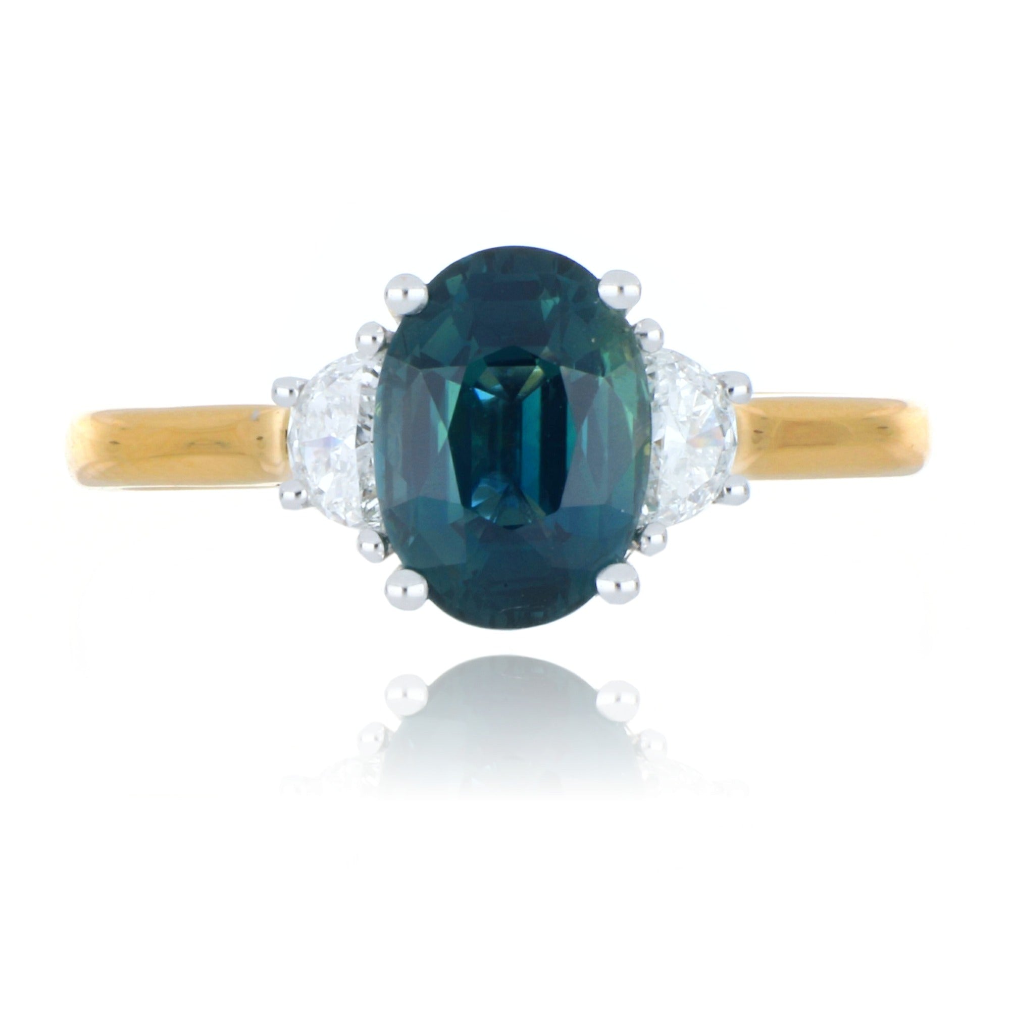 18ct Yellow Gold 2.35ct Teal Sapphire and Diamond 3 Stone Ring