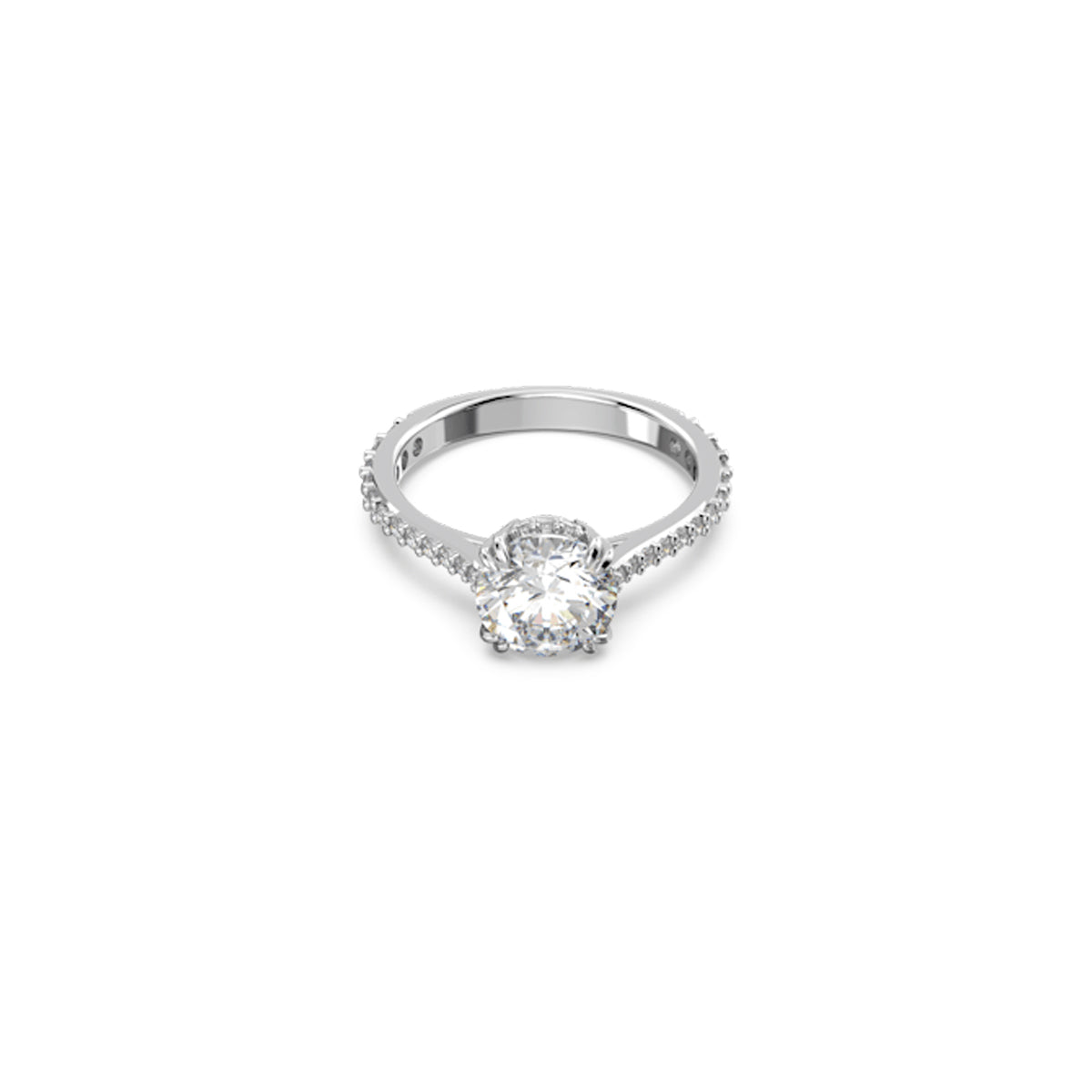 Proving there is power in simplicity, this Constella ring is a wardrobe essential. Expertly crafted, the scene-stealing princess-cut center stone is enhanced with elegant pavé on the gallery and along the rhodium plated band. Wear it solo and shine bright.