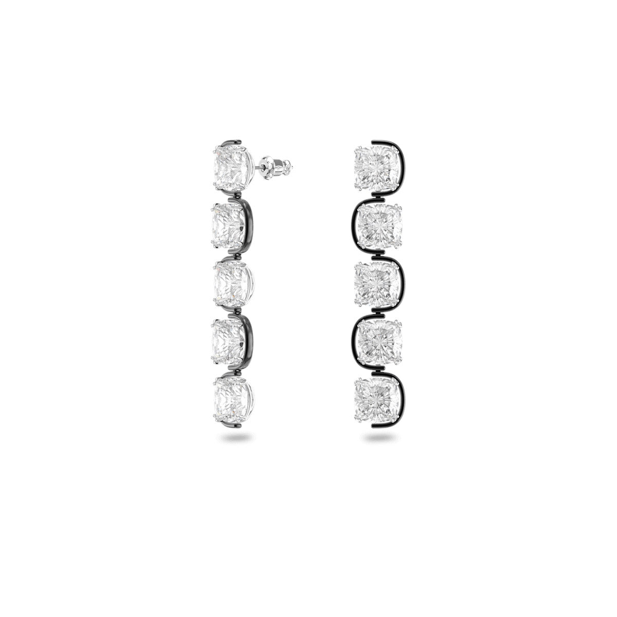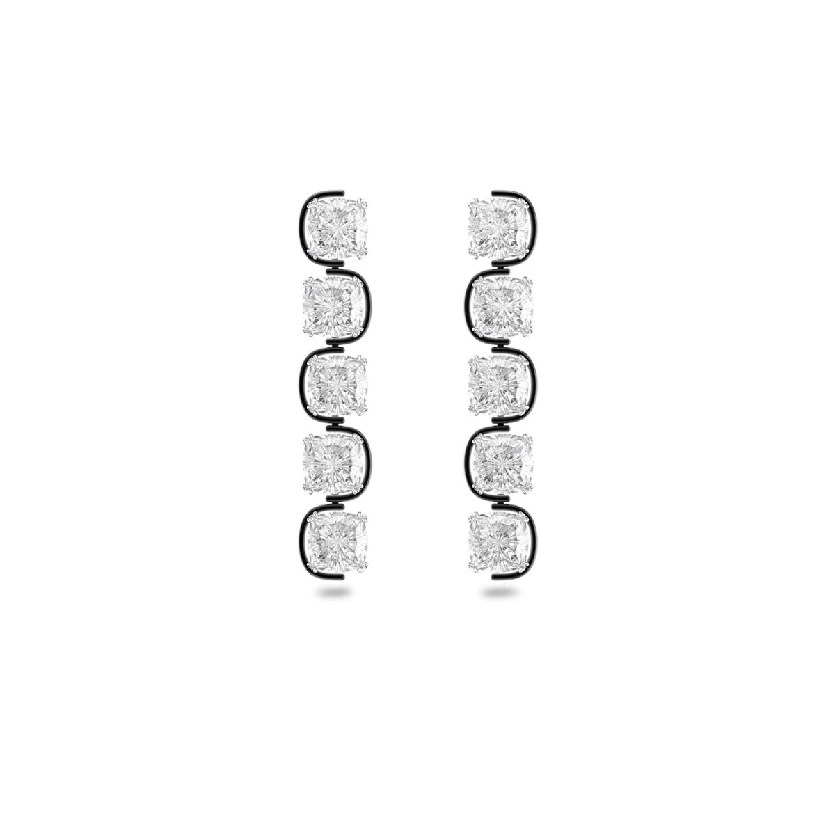 These clear crystal drop earrings are crafted from rows of cushion cut stones on modern rhodium plated prong settings. Dramatic and refined, they are statement-making yet timeless; the essential adornment for daytime or evening. Team them with a simple black polo neck to showcase their fluid sculptural form. These earrings are part of the Harmonia family.