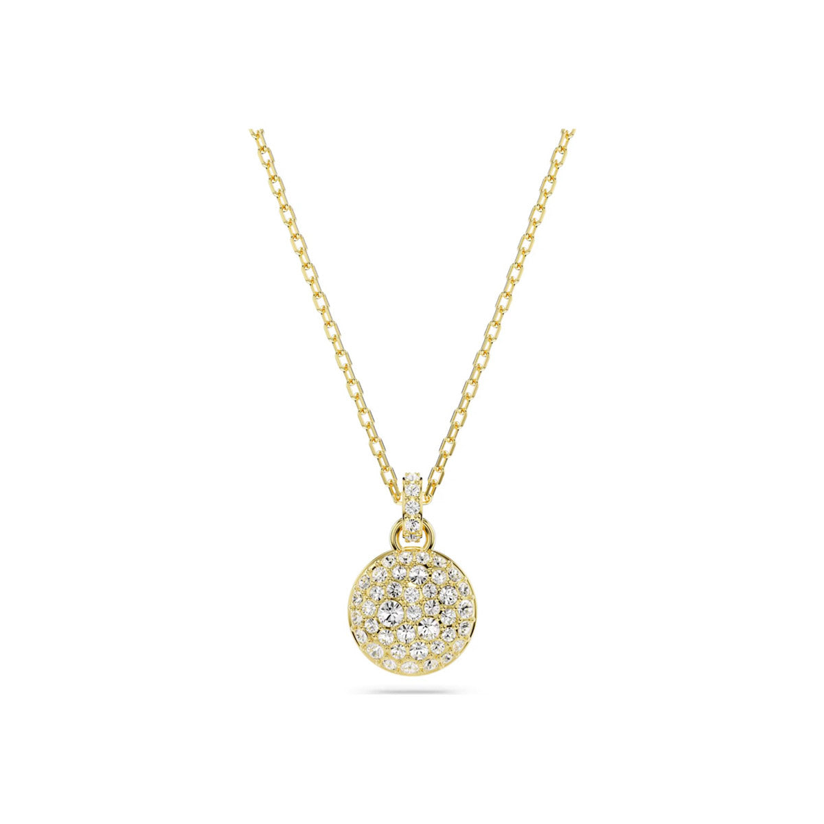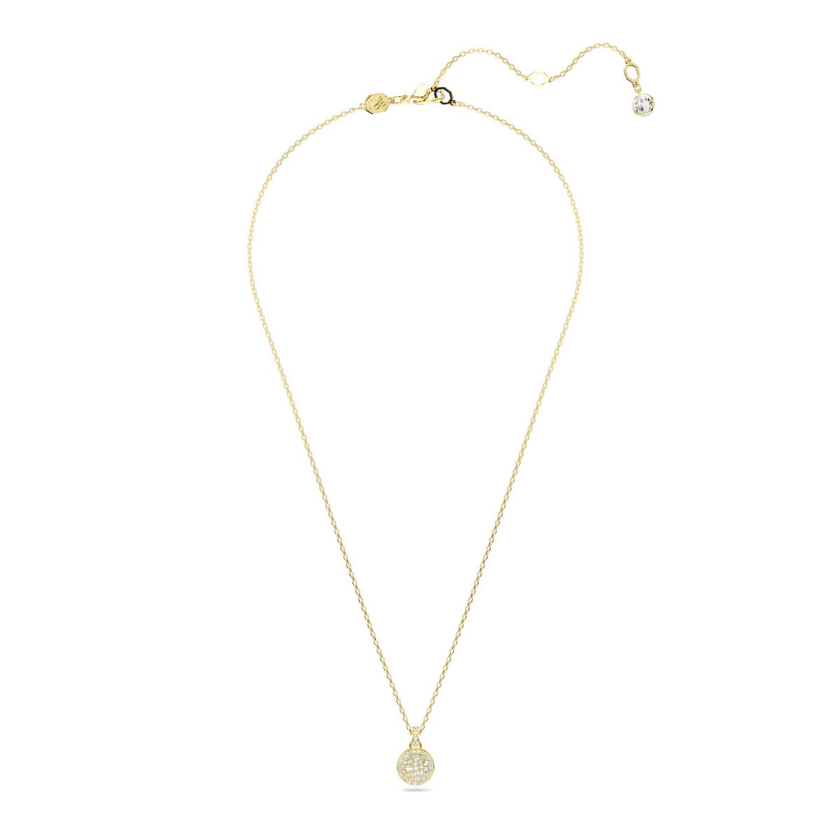 This galaxy-inspired pendant will bring dazzling impact to any style. The gold-tone plated design is worn on a delicate chain with a lobster closure and features a domed meteor motif that is beautifully adorned with a snow pavé of clear round crystals in different sizes. Wear it as a wondrous piece of light-catching joy.