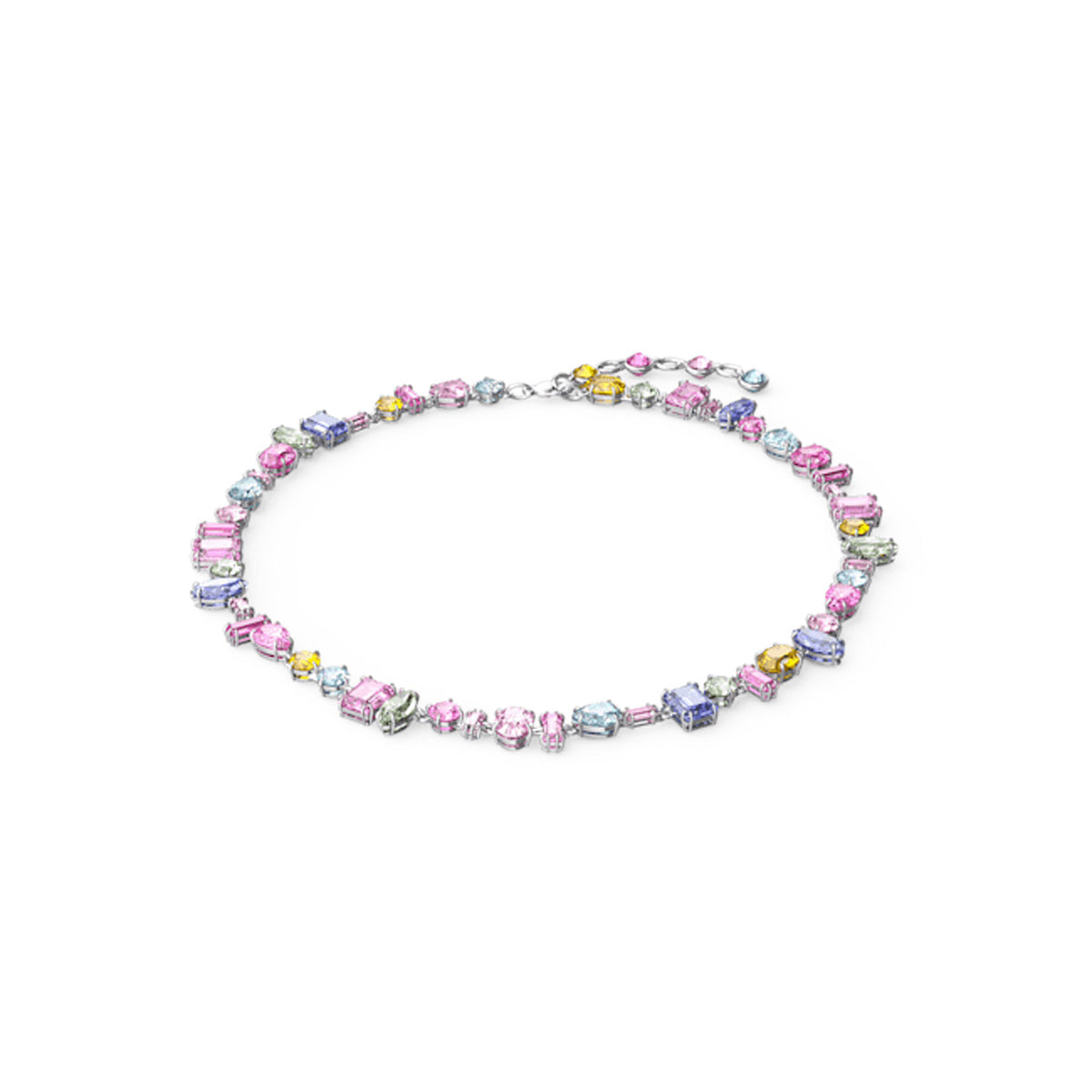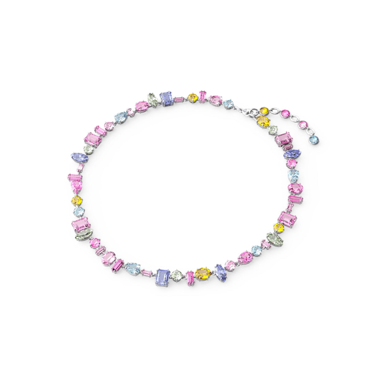 This necklace is expertly formed from a dazzling array of crystals in mixed, classic cuts, assembled in an unexpected formation. Finished with a silver-tone plated setting, highlighting pastel tones, this necklace makes a joyful and mood-boosting statement, however you might choose to wear it. This necklace is part of the Gema family.