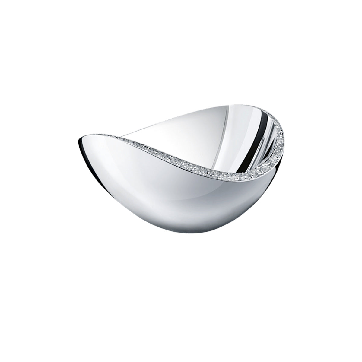 Give your home a sparkling touch with this decorative bowl. This silver-toned design combines organic shaping with a metallic shimmer effect. Made from stainless steel, it sparkles with approximately 1’600 silver-colored and clear crystals. Modern and sophisticated, it can be used to embellish a side table or shelf, or to collect small objects in the hallway. Pair with the bigger version for standout style. Decoration object. Not suitable for food. Not a toy. Not suitable for children under 15.
