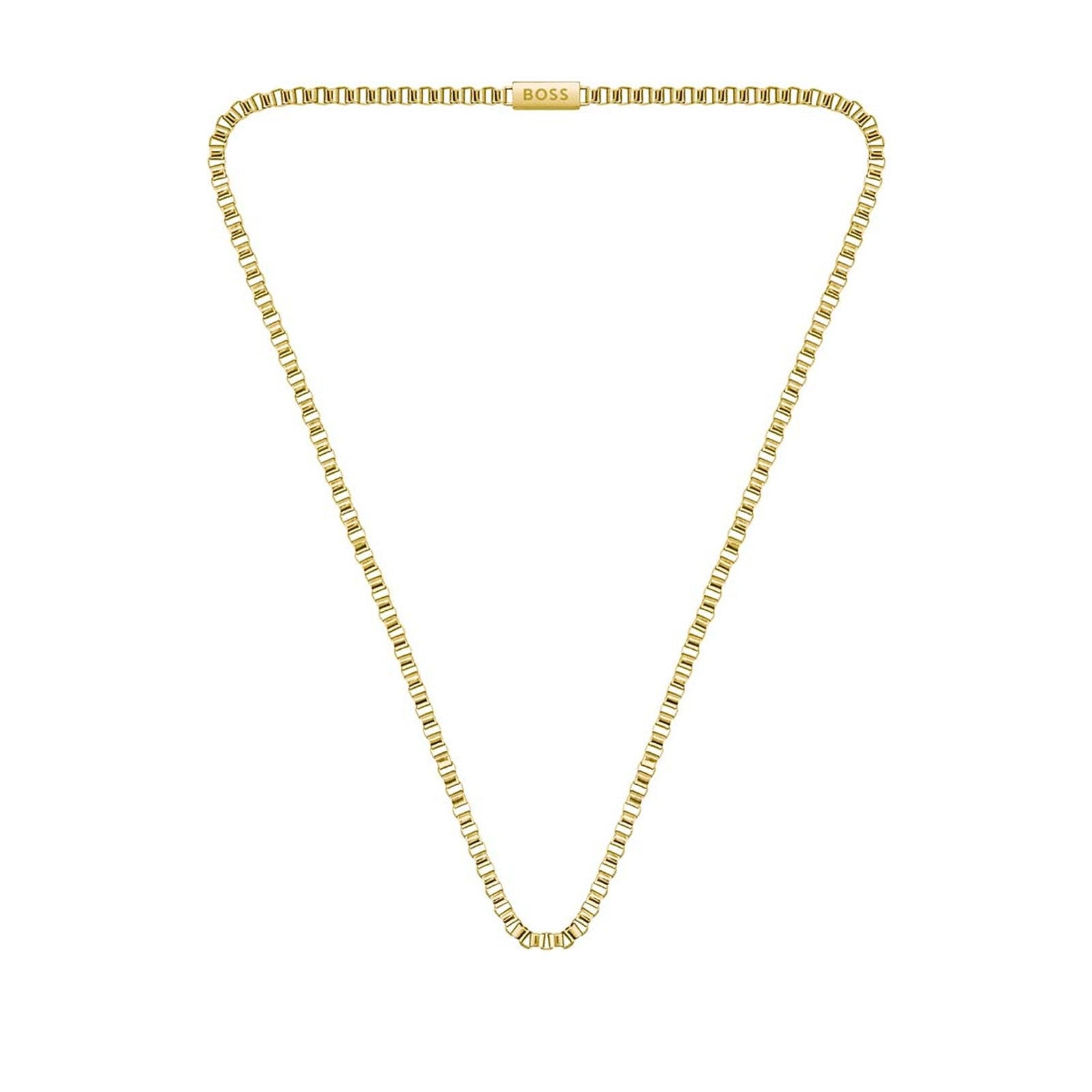 This yellow gold plated stainless steel chain necklace from BOSS is the perfect everyday chain. This classic and timeless necklace features an engraved BOSS closure and is a staple in any gents jewellery collection. Pair with a Yellow Gold Plated Stainless Steel BOSS Watch for a matching look.