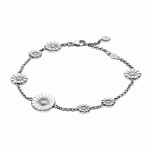 Always a symbol of natural beauty and optimism, the much loved daisy flower has been given a modern and striking make-over to create this charming sterling silver bracelet from Georg Jensen. Eight flowers - seven in silver and one reversible one with a white enamel back - are strung together in a form reminiscent of childrens daisy chains giving the piece a fresh and easy appeal. It makes a beautiful gift for any woman who is young at heart.