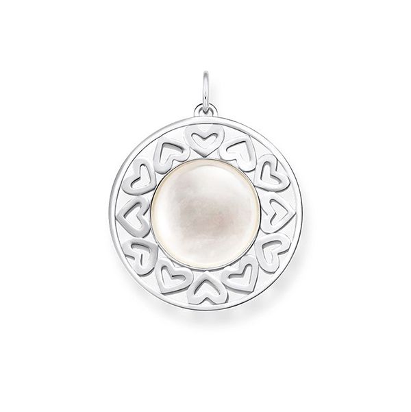 This beutiful silver pendant by Thomas Sabo features a circle of hearts running around a shimmering mother of pearl disc. Pair with other pendants on a chain to style you look your own way.
