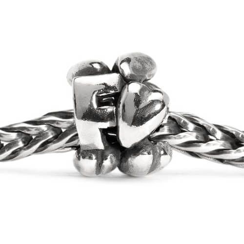 This sterling silver bead from Trollbeads features the letter F alonside small hearts.