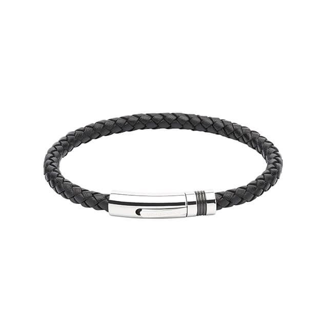 This Unique & Co bracelet features woven black leather and a stainless steel clasp.